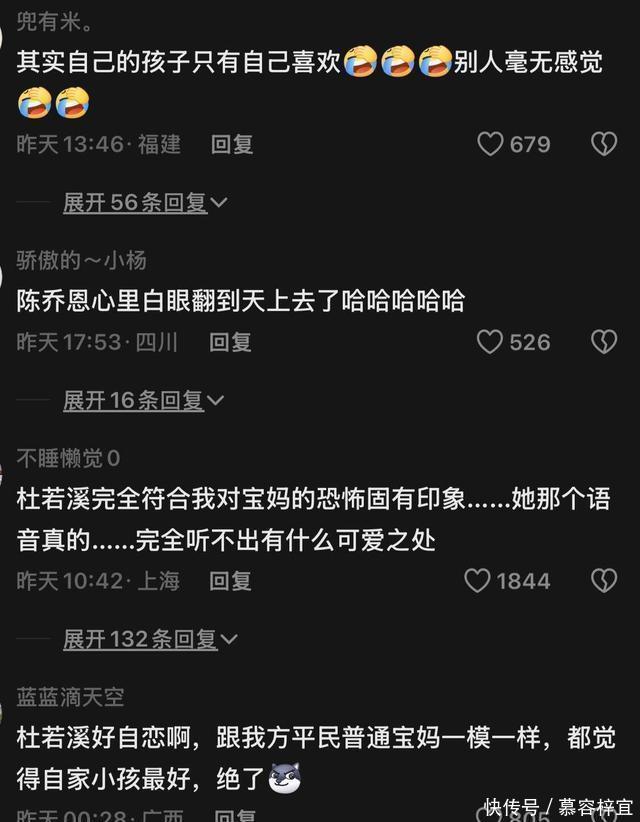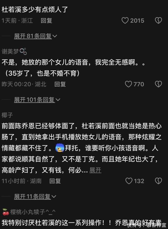 最后大家只能互相使眼色,假装玩手机躲清净:是啊,你家娃可爱是你的事,可谁也没义务当你免费的“娃粉听众”啊! 更让人膈应的是,杜若溪这种行为,可能本意是好的,但真的让人心里很不舒服。你看她反复强调“我女儿每天跟我撒娇”,语气里的得意都快溢出来了,好像在说“你看我有这么可爱的娃,你没有,多可惜”。 可她忘了,陈乔恩不是丁克,人家早说过“顺其自然”,而且她有钱、有能力,就算想生孩子,也轮不到别人指手画脚。 还有人替杜若溪辩解“她只是太喜欢自己的孩子了”,可喜欢孩子和尊重别人,从来不是二选一。 我另一个朋友也是宝妈,每次聊起孩子,都会先问一句“你们想不想看我家娃的照片呀”,有人说“想”她才分享,有人说“这会儿没兴趣”,她就立马转话题,从来不会硬塞。 反观杜若溪,明明看到陈乔恩已经敷衍到眯眼睛,还非要把女儿的语音往人耳朵里灌,这哪是分享?这是把自己的执念,强行套在别人身上。 更别提陈乔恩的处境,四十多岁,高龄产妇的风险谁都知道,她自己肯定比谁都清楚。可杜若溪只字不提这些,只一个劲说“有孩子多好”,好像生孩子是买个玩具,想要就能要,完全不顾别人的顾虑和选择。这种“我为你好,所以你得听我的”的逻辑,跟那些催婚时说“你再不结婚就没人要了”的亲戚,有啥区别?