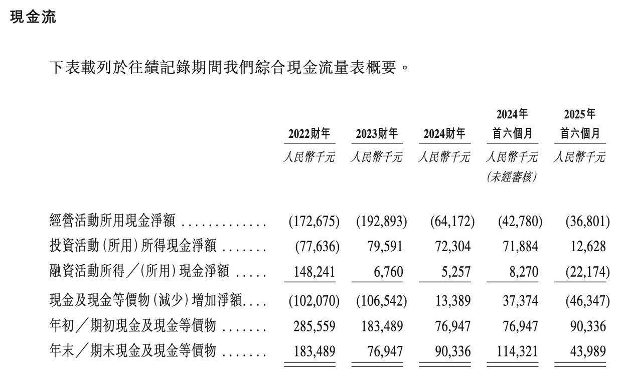 此外,于往绩记录期间,公司录得负经营现金流。于2022财年、2023财年、2024财年及2025年首六个月,公司的经营活动所得负现金流分别约为人民币172.7百万元、人民币192.9百万元、人民币64.2百万元及人民币36.8百万元。