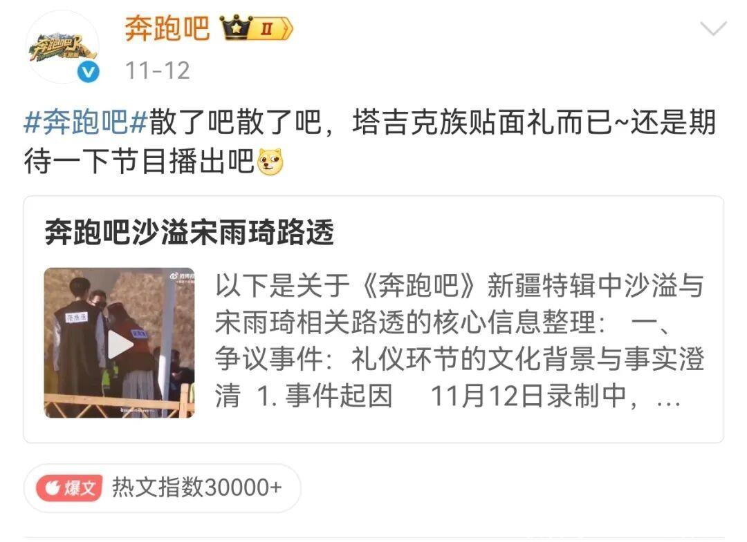 而《奔跑吧》节目组很快回应,说这是塔吉克族的传统习俗。可了解情况的人都知道,人家这个习俗里,成年异性之间顶多是轻扶头部,亲吻额头都是对同性或小孩的,节目组这解释实在有点说不过去。