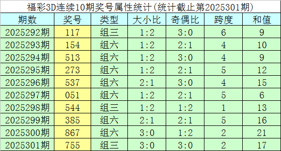 开奖回顾:福彩3D第2025301期奖号为755。奖号形态为组三,大小形态为大大大,奇偶形态为奇奇奇,和值为17,跨度为2。