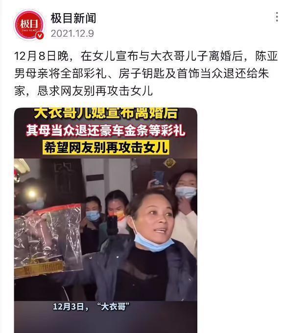 2021年12月,陈亚男通过社交平台宣布与朱小伟离婚,结束为期一年的婚姻关系,但不嫌事大的网友又开始起哄说:“陈亚男从一开始就是别有目的,离婚不过是计划中的一环。” 面对网友们的攻击,陈亚男的母亲将全部彩礼、房子钥匙及首饰全部退还给了朱家,并且视频账号也停止了更新,以此来证明离婚是因为感情问题而并非另有所图。